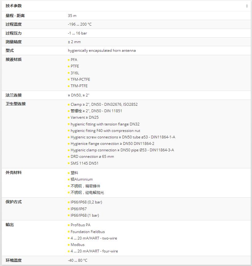 VEGAPULS 63雷達傳感器用于對侵蝕性液體進行測量,或滿足特殊的衛生要求。 適于在儲藏和過程容器,反應堆以及配料容器中測量。 VEGAPULS 63 封閉型天線系統保護不受污染,確保免維護持續工作。 端面對齊安裝能確保優化的清理工作,滿足更高的衛生要求。